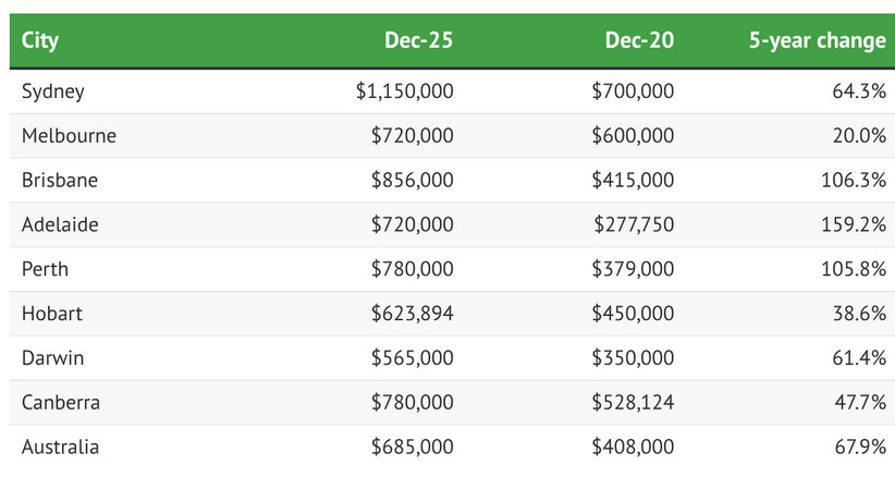 As this table illustrates, from 2020 to 2025 the price of certain housing in Australia increased on average by around 70% - in some markets by up to 160%. There were no CGT changes to account for this!