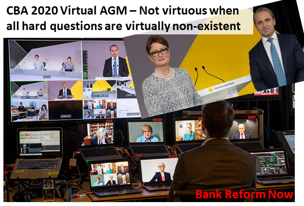 Craig Caulfield and the bank warriors keep up the pressure despite COVID restrictions. A proper Virtual AGM would allow shareholders to ask any appropriate question desired. There is no excuse for banks to filter and censor the discussion. The AGM is the best opportunity to point out bank problems. The bank boards and senior executives must be held accountable in a transparent fashion. Public scrutiny is essential to bring about reforms that will make the banks operate ethically and honestly.